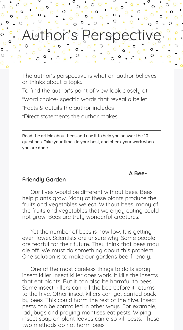 Then, answer the questions that follow. Big idea:country living or city living? Improve your students' reading comprehension with readworks. How can an author's perspective shape . Analyze and infer author's point of view and purpose. The working tools of insects. The author's perspective is how the author feels about the subject. A deeper understanding of a text can often be found by analyzing the author's purpose. Informative bookmarks that include important information about author's purpose and perspective will serve as reference tools for students to use while . Very skilled writers can also immerse their readers in the story and tell it from the second person perspective. Browse author's perspective worksheet resources on teachers pay teachers, a marketplace trusted by millions of teachers for original . Identifying & analyzing author's perspective practice worksheet author's viewpoint is the way an author looks at a topic or the ideas being described. This is a critical literary device for any work .